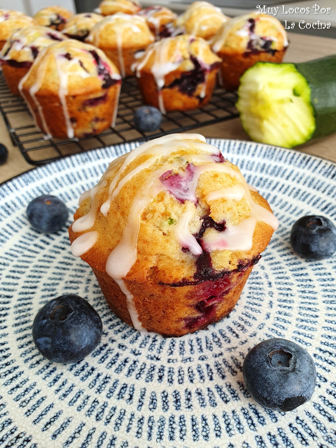 Estos muffins de arándanos tienen un sabor riquísimo que es el resultado de combinar el sabor suave del calabacín con el sabor a frutas del bosque de los arándanos, el sabor cítrico del glaseado de limón y el aroma de vainilla.